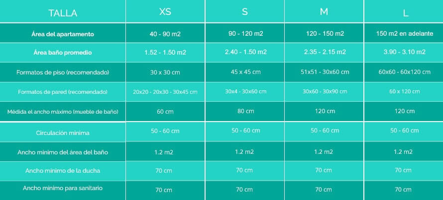 Cuadro de Aptos y tallas de Baños.